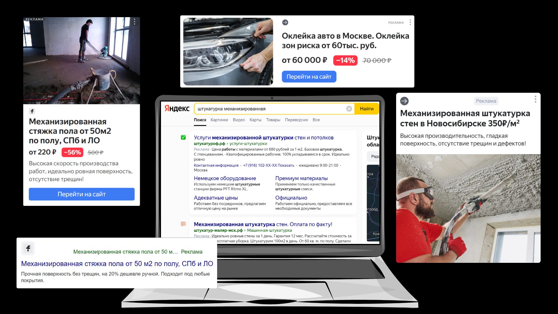 Работаем в строительной тематике с 2017 года, с такими нишами как Ремонт квартир, Строительство домов, Натяжные потолки, Фундамент, Механизированная штукатурка, Стяжка пола, Лестницы, Бани и др.